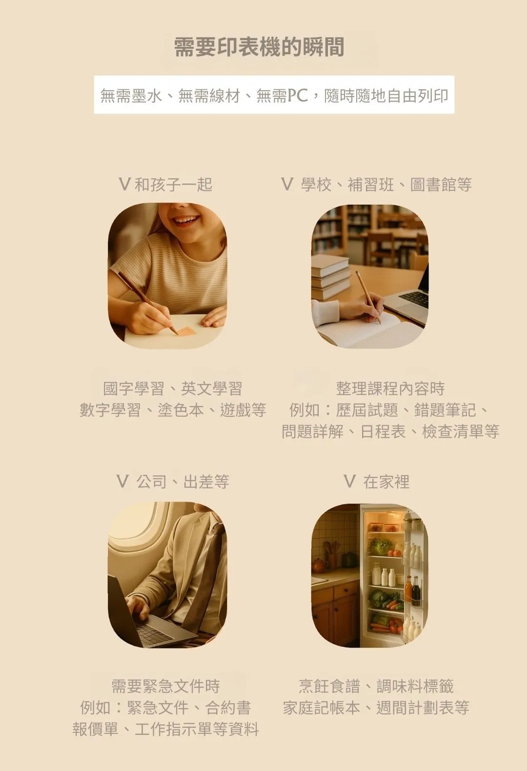 練習單、圖畫、行程表、樂譜、生活小表格、學校通知等等