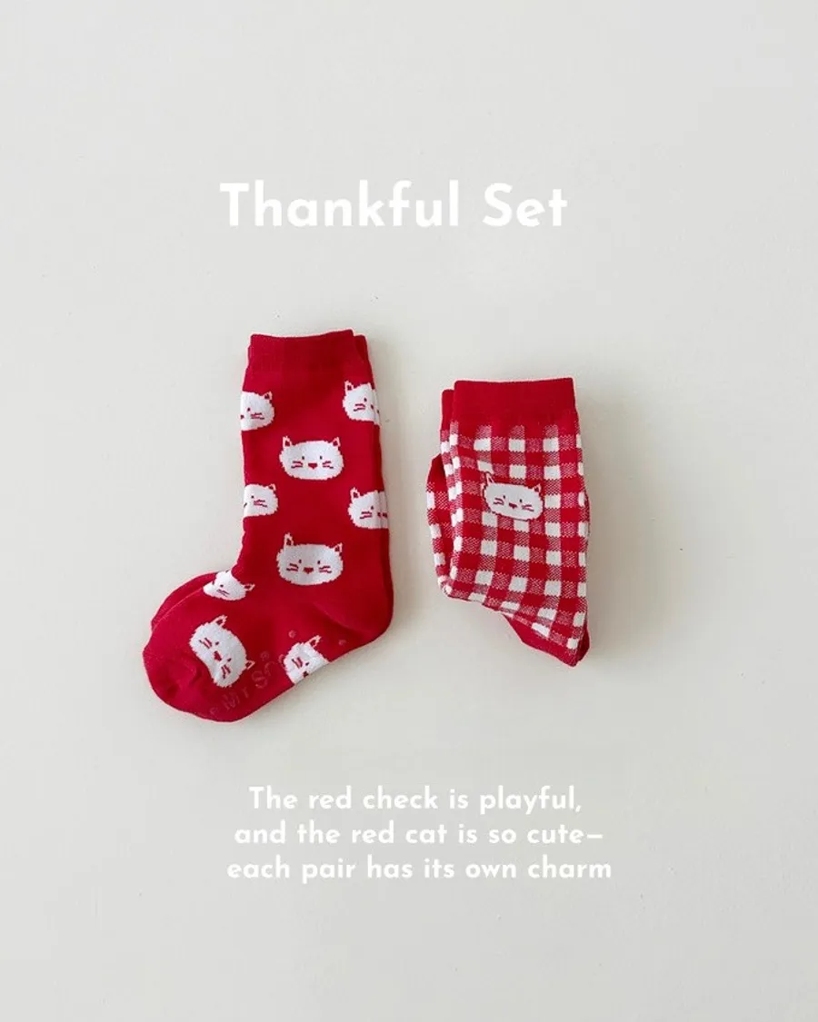 設計走簡單路線,但紅格紋很俏皮、紅色貓咪又可愛,兩雙各有各的魅力,輪流穿會很有趣。